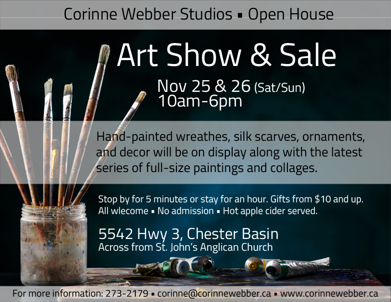 This studio open house will feature Corinne’s hand painted wreaths, fine silk scarves, ornaments, and other new decor, along with her latest series of full size paintings and collages.